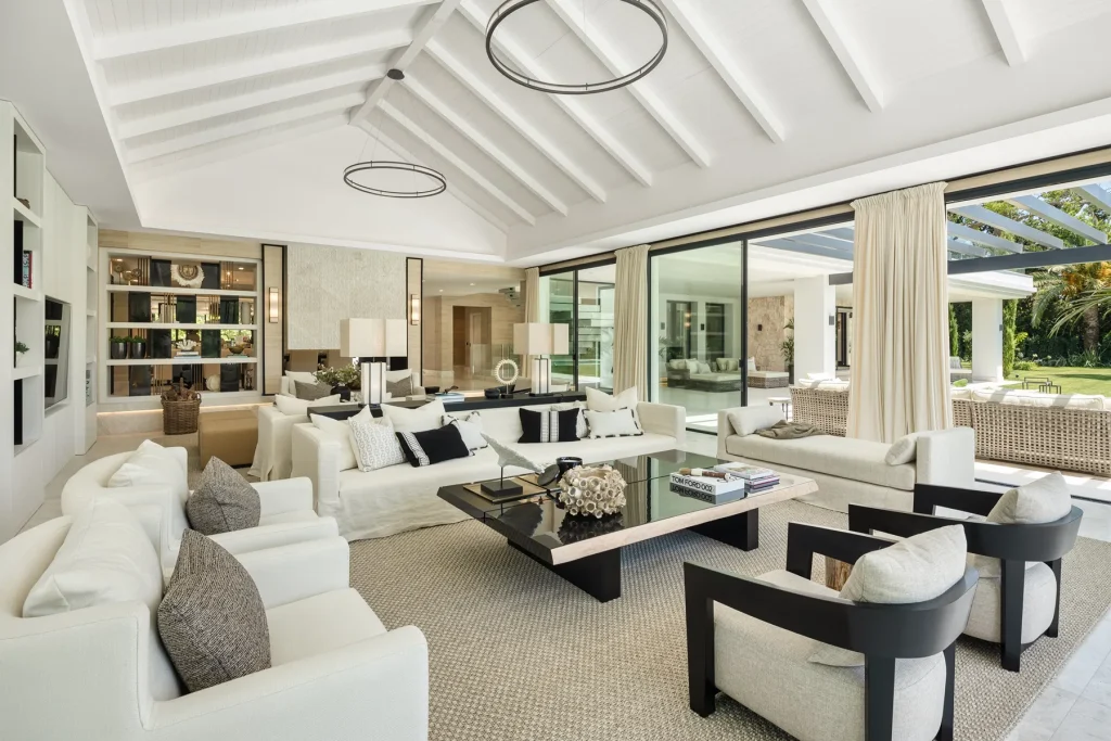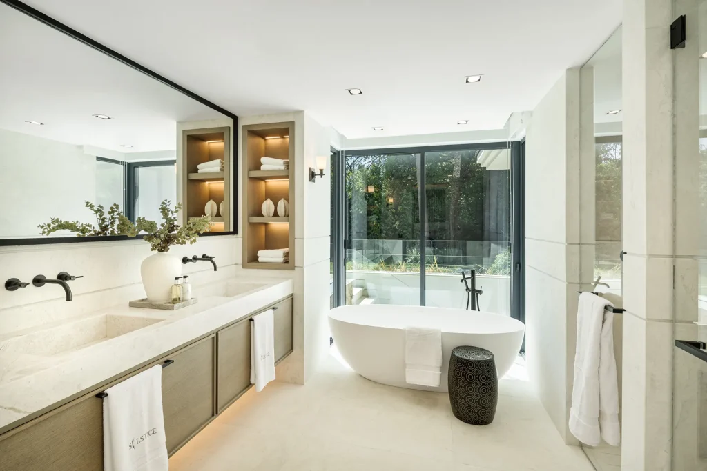 The villa boasts stunning en-suite guest bedrooms on both the ground floor and the lower level, each meticulously designed to maximize modern comfort. The upper level is exclusively reserved for the master bedroom, an incredibly private retreat with generous proportions. It includes an impressive dressing room, a luxurious master bathroom, and access to a private terrace with direct views of the golf course. On the lower level, residents can enjoy a variety of exceptional amenities. These include a spa with an indoor pool, sauna, and Turkish bath, as well as an entertainment room and cinema room for leisure.