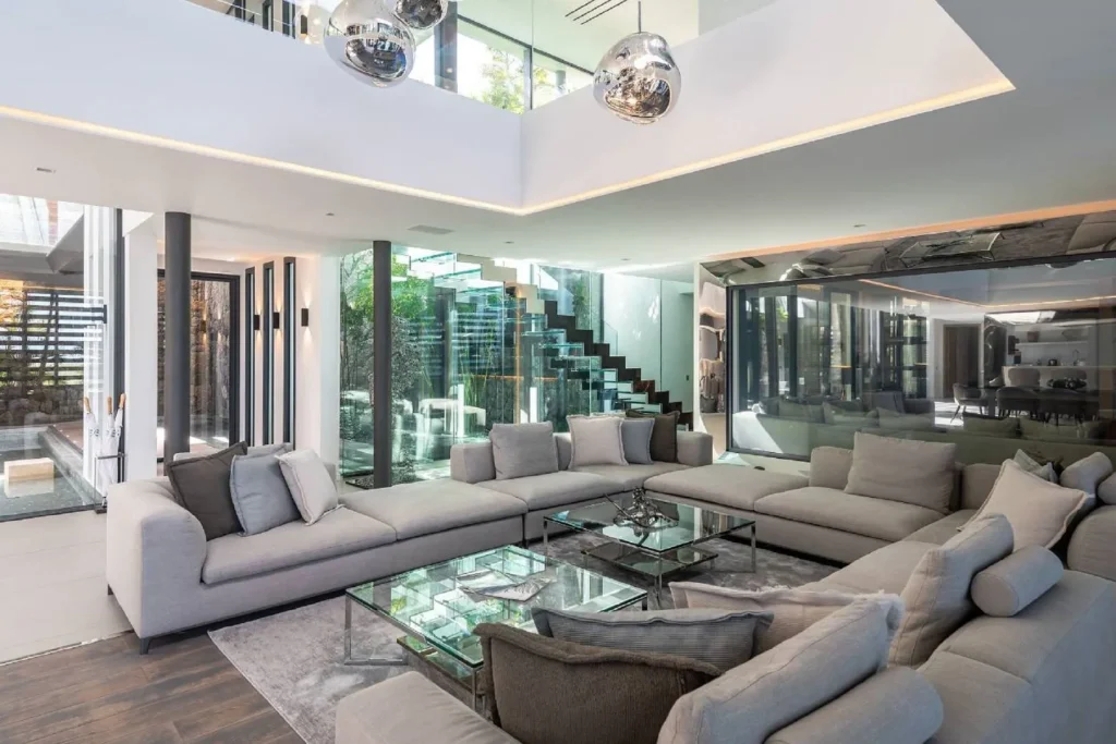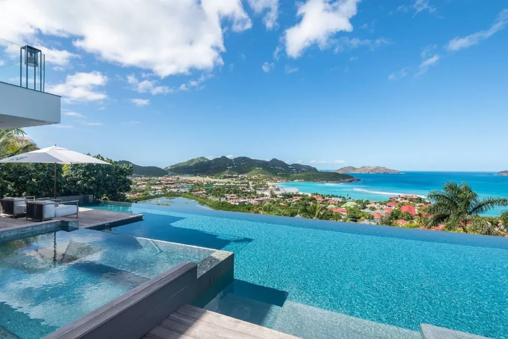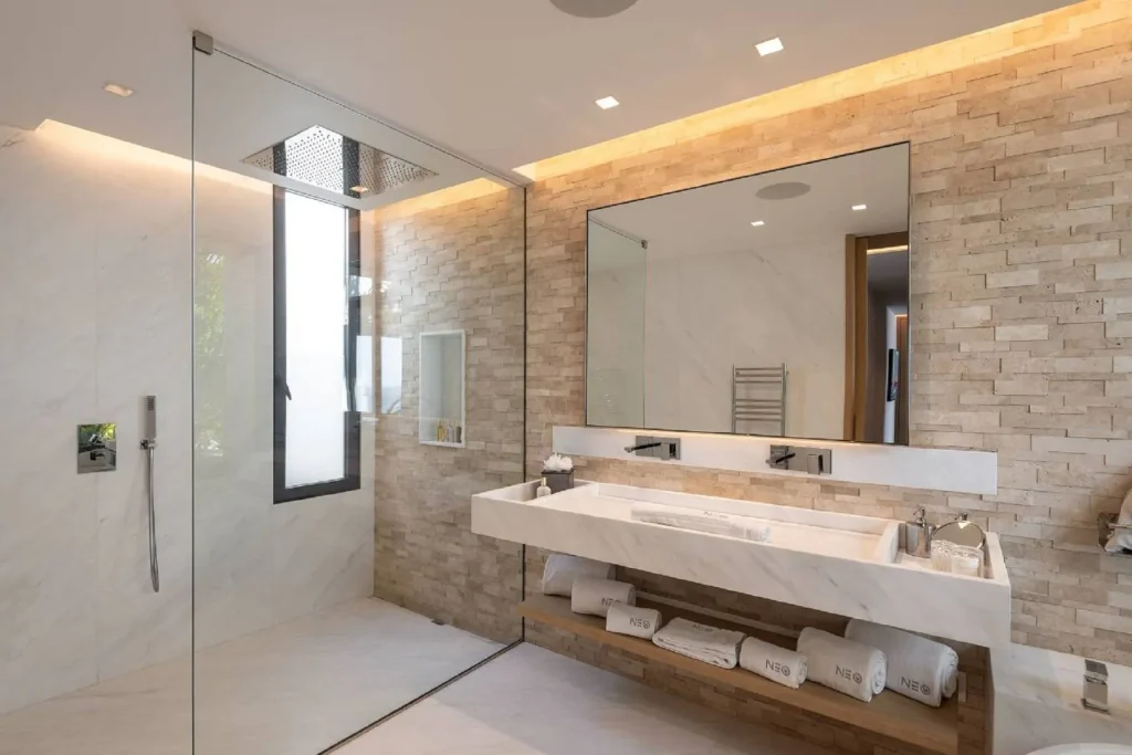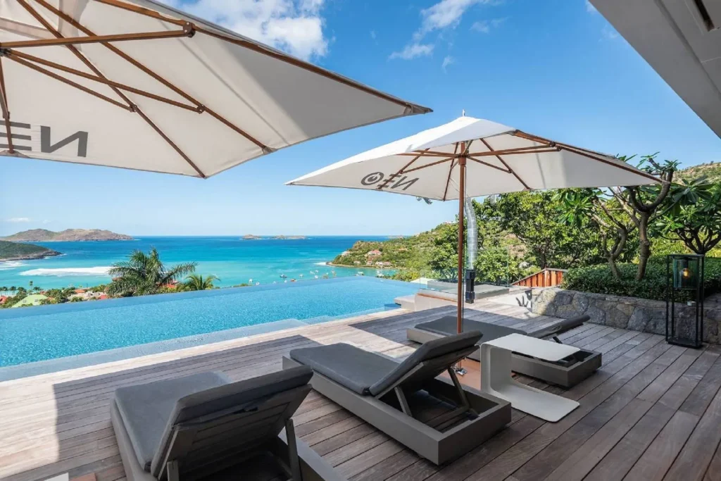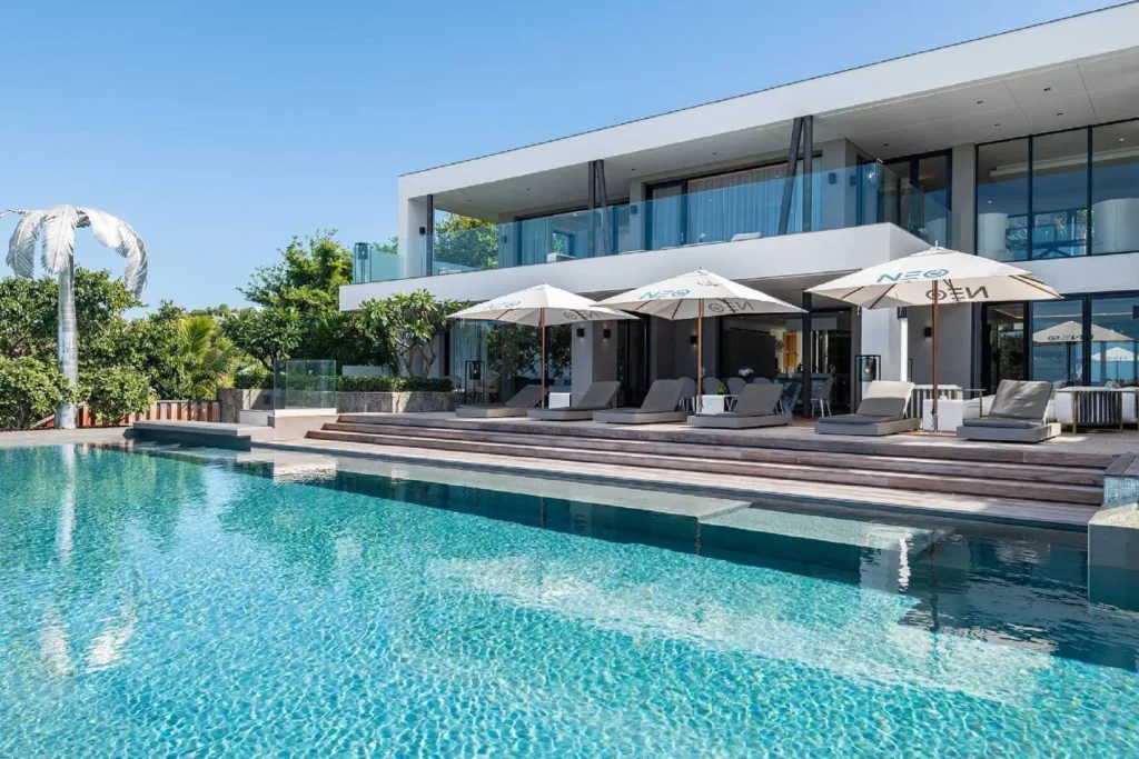 Villa Neo is fully air-conditioned and thoughtfully designed. The first floor hosts two kitchens, one of which is a chef’s dream, a spacious living room, a media room, and a dazzling entertainment room. Two bedrooms, including one of the premiere suites, open onto the deck, while a third enjoys a tranquil garden view. An elegant glass staircase leads to the upper level, home to an office, an additional premier suite and two connecting guest bedrooms with ocean views and private terraces.