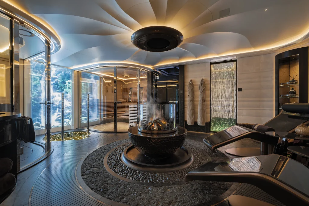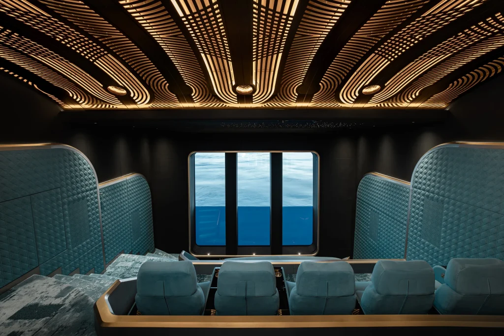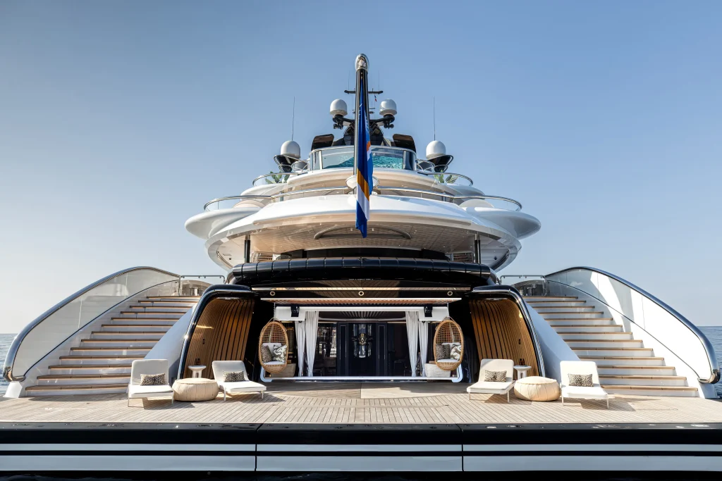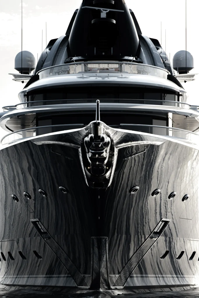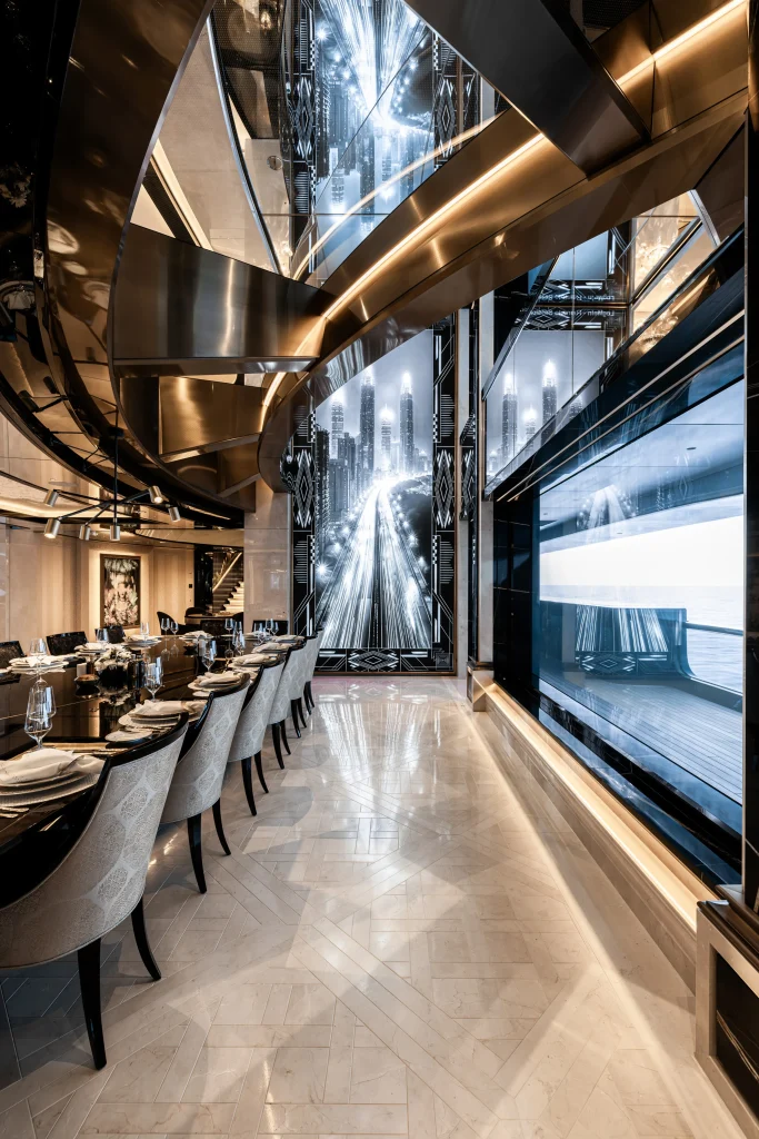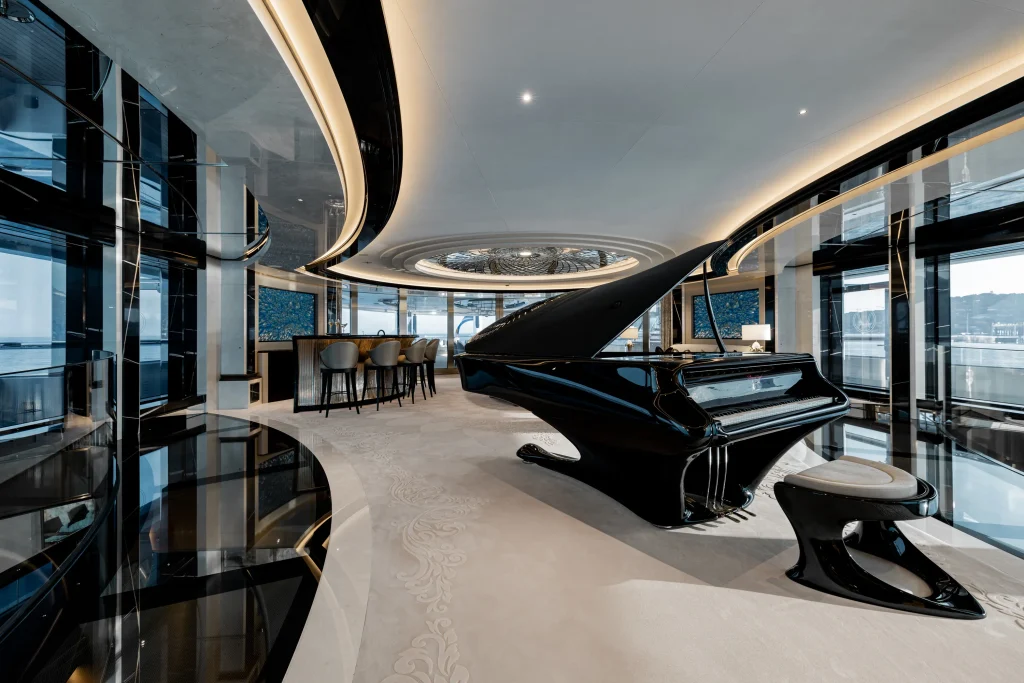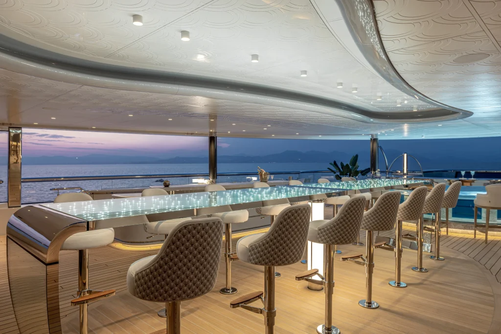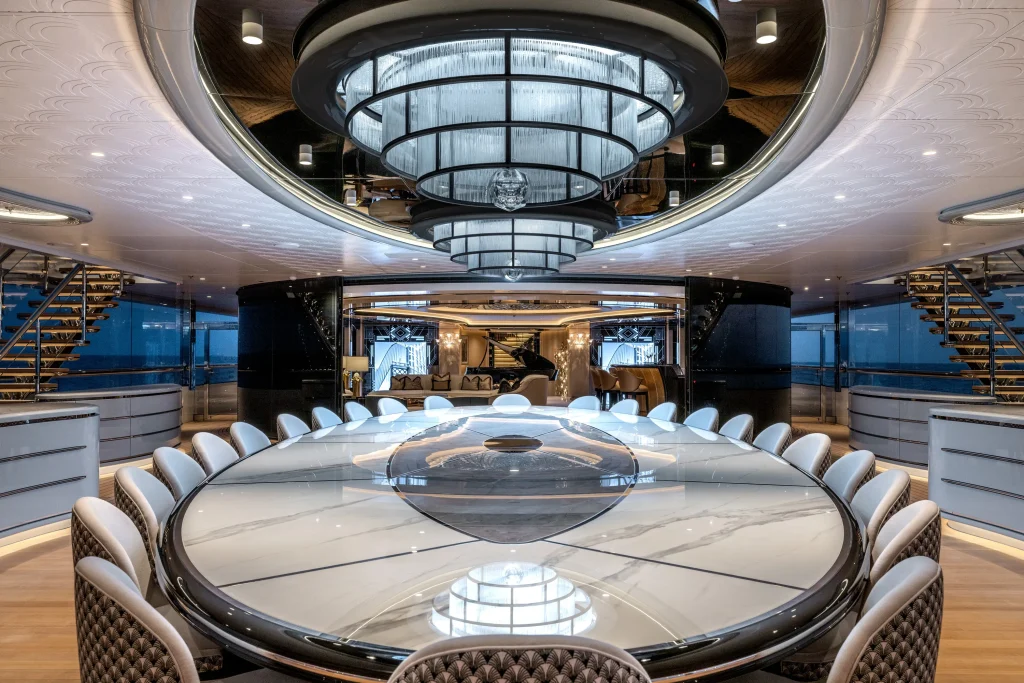 Built with a steel hull and aluminium superstructure, she offers greater on-board space and is more stable when at anchor thanks to her full-displacement hull. Powered by twin MTU engines, she comfortably cruises at 12 knots, reaches a maximum speed of 18 knots with a range of up to 6,000 nautical miles from her 360,000 litre fuel tanks at cruising speed.